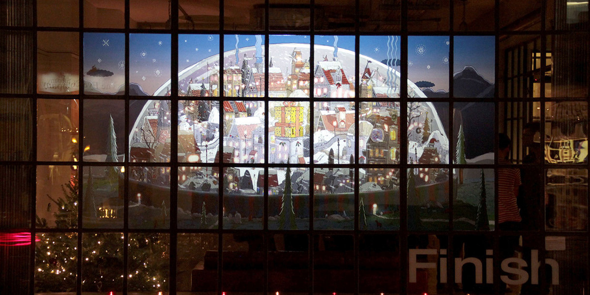 We came up with the idea of creating a snow-globe as the window seemed like a natural container, or porthole, to a world in which the snow globe could exist. Working together with the incredibly talented illustrator Jean de Wet, our scene was inspired by classic depictions of quaint European villages in the mountains during Christmas time. The environment is scattered with little animation loops so the more you study the details and animation, the more you see - a kind of a Where is Wally type scenario in which the viewer sees something new every time they walk by. The illustration was initially done with pen and paper. It was scanned and coloured in Photoshop and then broken up into individual layers that were prepped for animation. The compositing was done using After Effects.