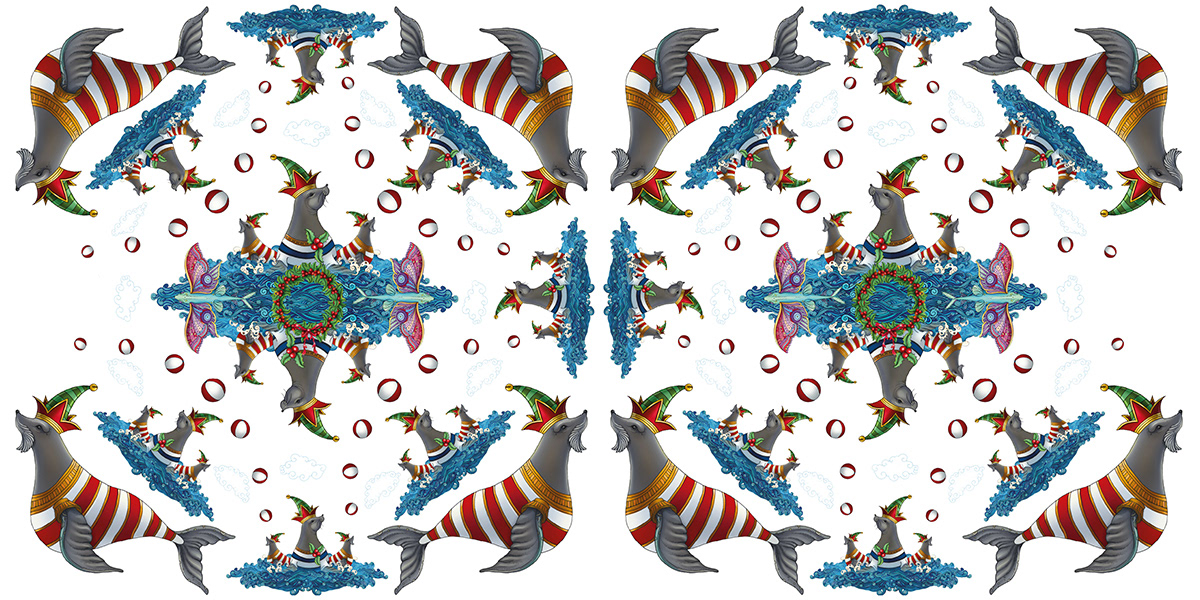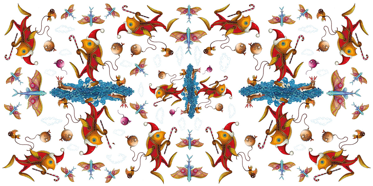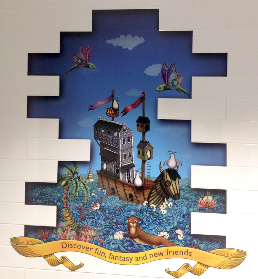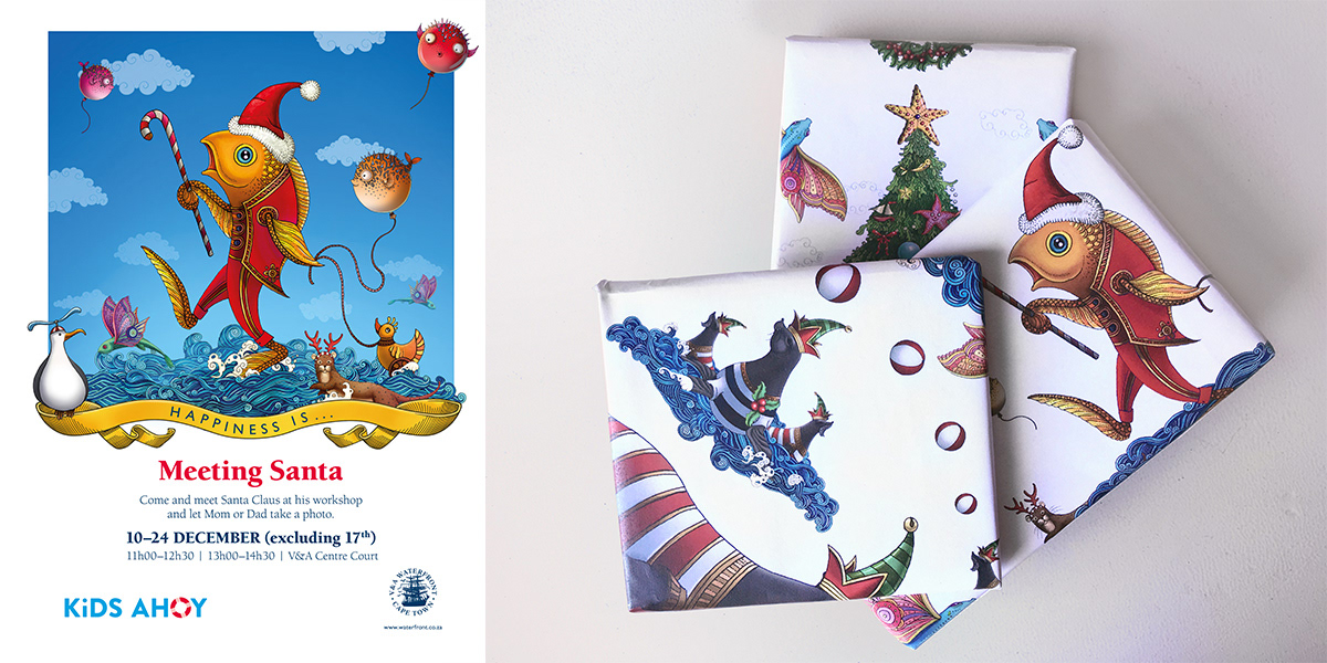 We drew our design inspiration from the waterfront, aquatic creatures and the animals and flora commonly found in Cape Town. We interpreted all of this with a fantasy twist in bright bold colours that would appeal to children. Our sea plants for example are inspired by proteas and fynbos while ships and whales act as islands that support iconic waterfront buildings. We designed all the elements in such a way that they could be used individually or arranged in new compositions for extended campaigns. The material is used in a variety of ways, ranging from murals, gift wrapping paper and posters to colouring in books.